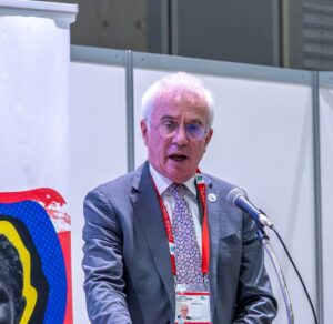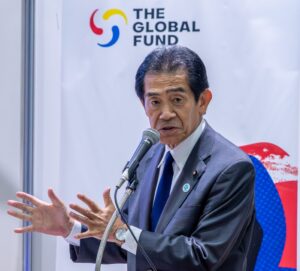 冒頭、開会挨拶にたったグローバルファンドのピーター・サンズ事務局長は、グローバルファンド設立以来の日本の支援への感謝と高い日本の技術力に期待を述べるとともに、日本をはじめとするパートナーの協力により6500万人の命が救われ、三大感染症による死亡率は合計63%減少したとこれまでの成果を紹介しました。しかし、援助資金の削減・紛争・気候変動等の影響によりこれまでの成果が脅かされていると警告を鳴らし、保健システムの長期的な持続可能性を確保する上で重要なのは、感染症対策への支援を継続しつつ、段階的に低・中所得国自身が保健財政の責任を負うように変革していくことだと訴えました。